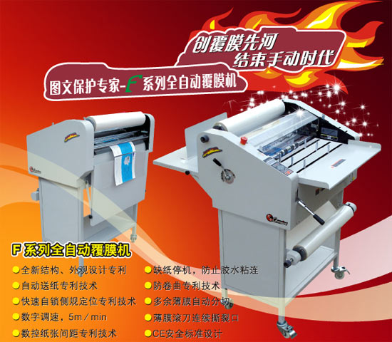 F系列覆膜機是惠寶公司根據(jù)市場需求經(jīng)過多年的進行研制的預(yù)涂膜復(fù)合設(shè)備。本機集自動進紙—數(shù)字調(diào)速-缺紙停機—薄紙防卷—薄膜去邊—薄膜連續(xù)切口—數(shù)控紙張間距等先進技
