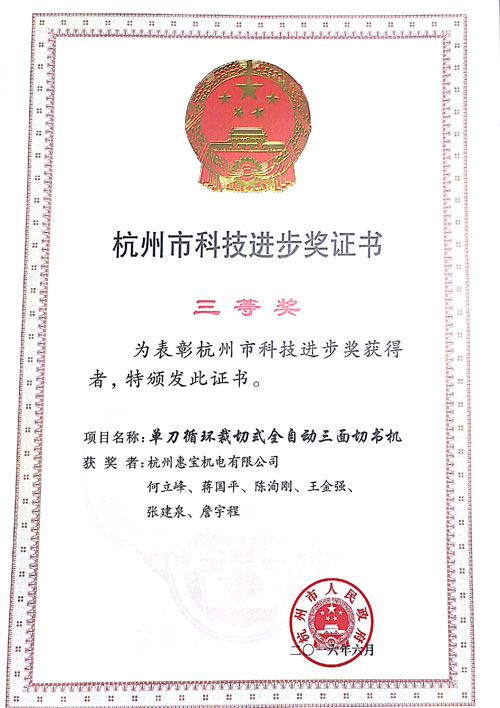 杭州惠寶 行標 小型切紙機 第一起草單位 證明文件 20161213