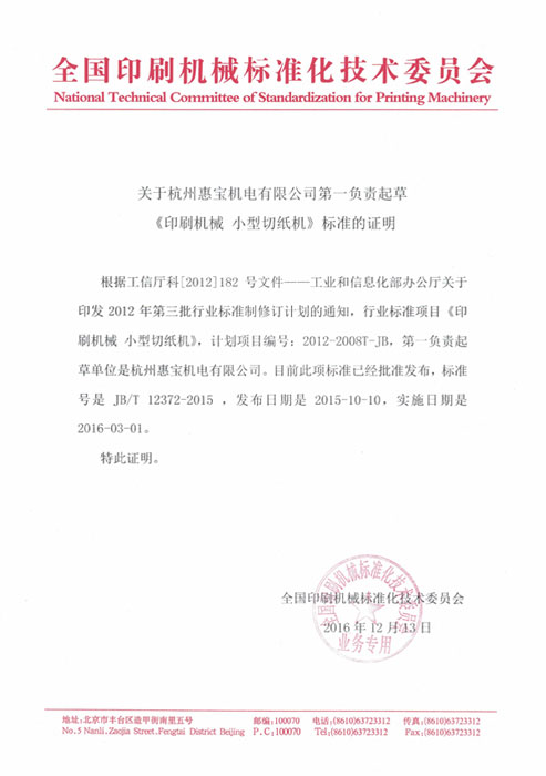 杭州惠寶 行標(biāo) 小型切紙機(jī) 第一起草單位 證明文件 20161213