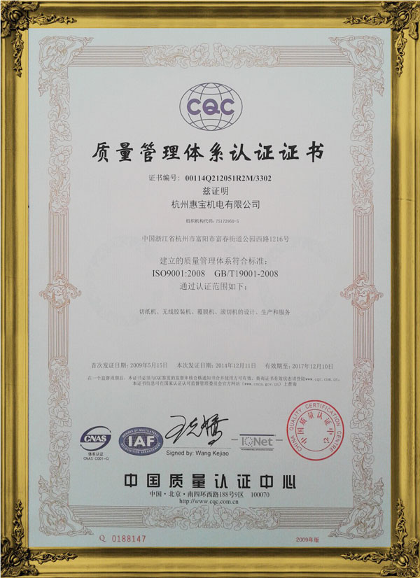 惠寶公司質(zhì)量管理體系認(rèn)證證書-ISO9001