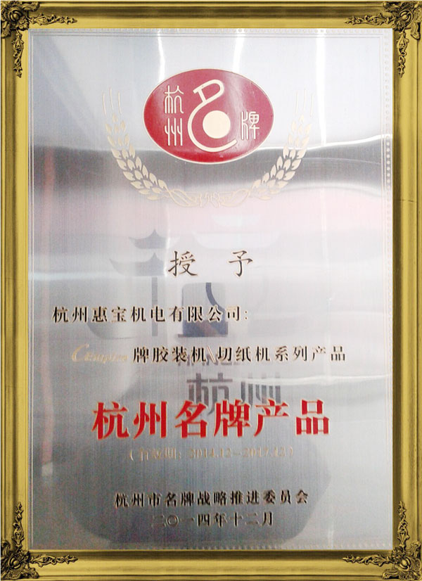 2014年彩霸牌膠裝機(jī)、切紙機(jī)系列產(chǎn)品榮獲杭州名牌產(chǎn)品