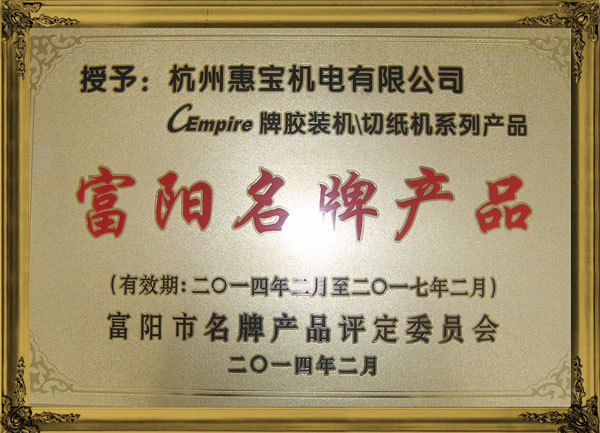 2014年彩霸牌膠裝機、切紙機系列產(chǎn)品榮獲富陽名牌產(chǎn)品