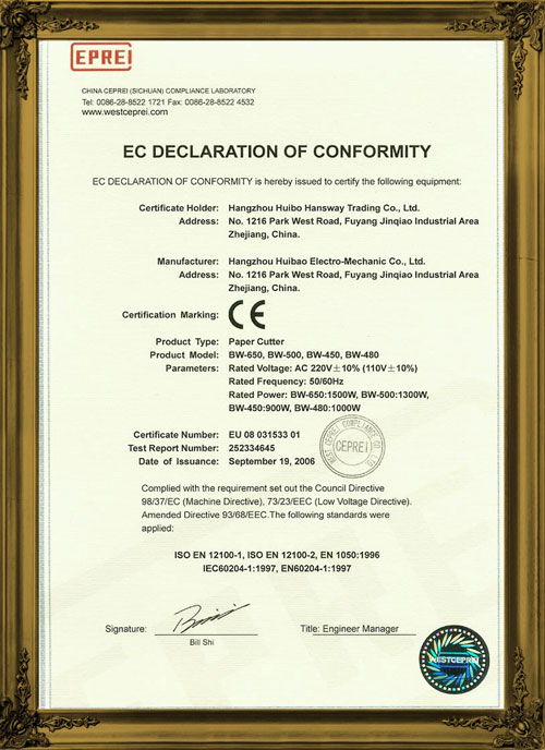 2006年切紙機(jī)CE證書