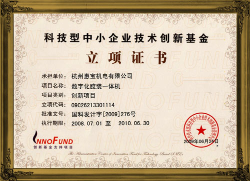 2009年科技型中小企業(yè)技術(shù)創(chuàng)新基金立項(xiàng)證書(shū)
