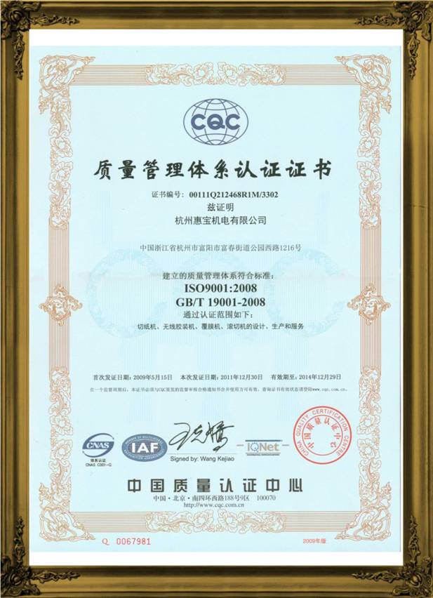 惠寶公司質(zhì)量管理體系認(rèn)證證書